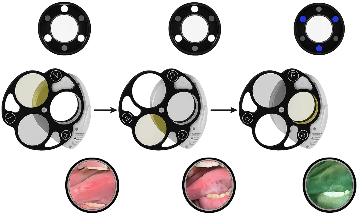 Mantis combines traditional white light, polarized white light, and fluorescence visualization in one system, giving practices multiple ways to evaluate oral tissue during the exam.